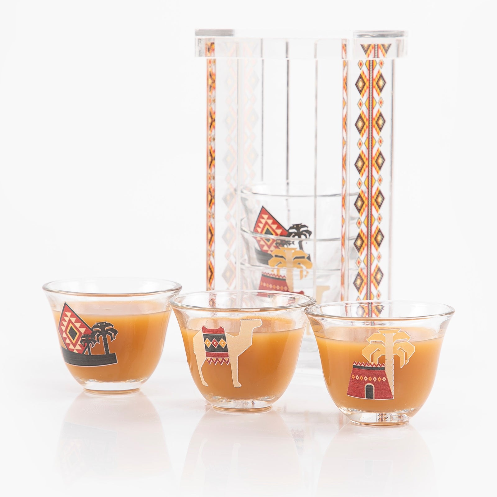 The set features a transparent acrylic holder in a rectangular shape, inspired by traditional Sado art that highlights heritage patterns. It comes with 6 coffee cups adorned with artistic details reflecting...